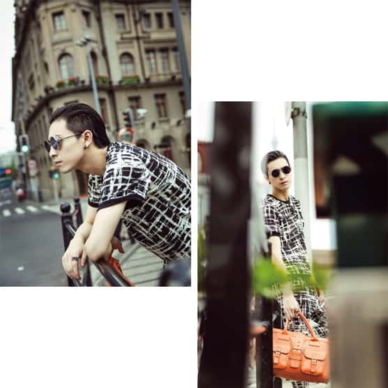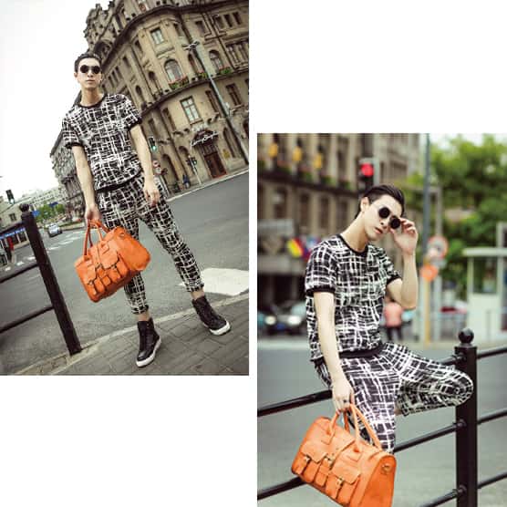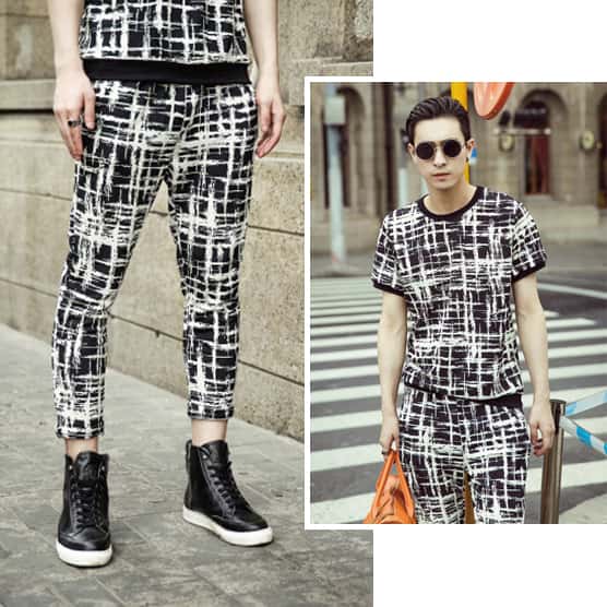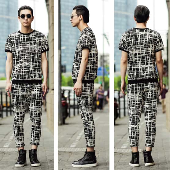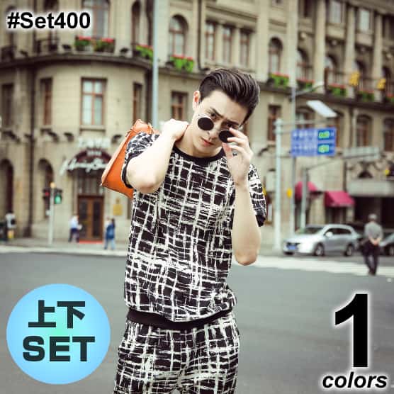 ブラックとホワイトの配色が織り成す個性的な柄が注目を集めること間違いなしのセットアップスタイルです。