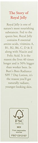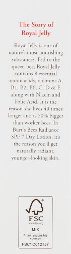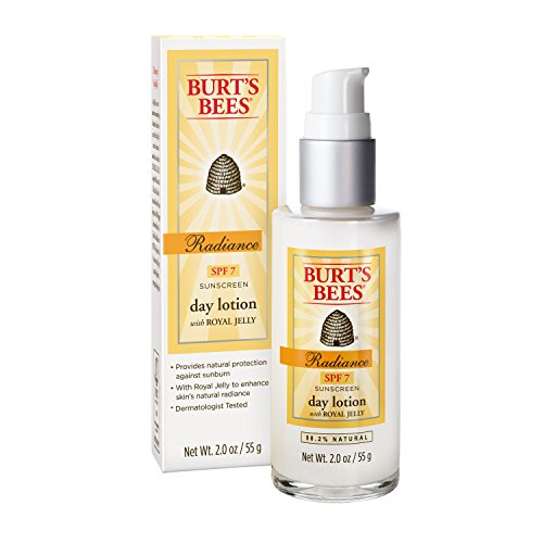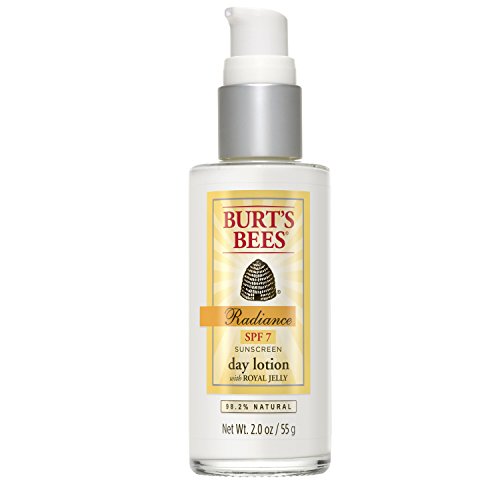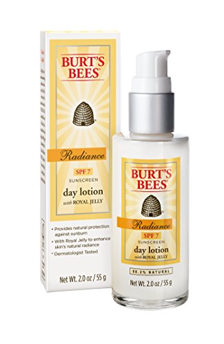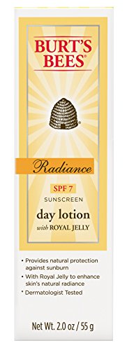 Enhance your skin’s natural radiance while helping shield it from the sun with lightweight Burt’s Bees Radiance Day Lotion SPF 7. Premature aging, including the development of lines and wrinkles, is associated with sun exposure. This tube of daily facial lotion with SPF is made with titanium dioxide and zinc oxide to provide natural protection from the sun. Plus calendula and golden seal extracts soothe and soften skin. With Royal Jelly to help promote skin’s natural radiance, this daily face cream reduces the appearance of fine lines and wrinkles. Fed to the queen bee, nourishing Royal Jelly contains 8 essential amino acids, vitamins A, B1, B2, B6, C, D and E along with niacin and folic acid. It is the reason she lives 40 times longer and is 50% bigger than worker bees. With this 98.2% natural face moisturizer, you’ll get radiant, more moisturized and smoother skin. Use this dermatologist-tested day lotion with SPF as part of the Burt’s Bees Radiance natural skin care regimen. Put the power of nature to work for your skin with Burt’s Bees.Feature