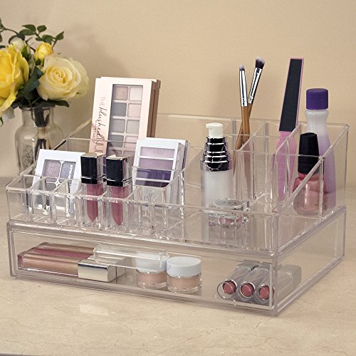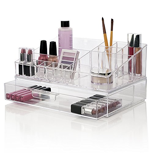 Build your own custom makeup station. Use this organizer and drawer stacked or on their own to store compacts, makeup palettes and other cosmetic items. The drawer is also great for storing jewelry items like necklaces, earrings and more. Add additonal drawers or other components within the Audrey Stackable Collection for additional storage space.