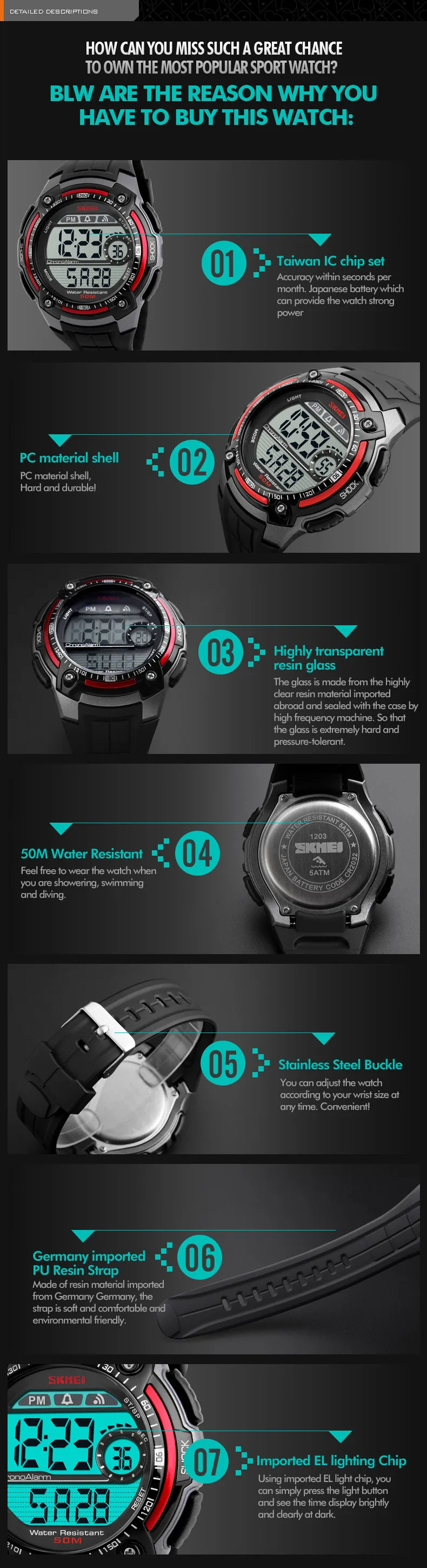 Feature:Back Light,Alarm,Water Resistant,Shock Resistant,Stop Watch,Complete Calendar,Auto Date,LED display,Diver