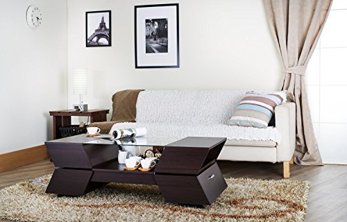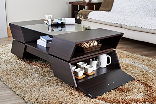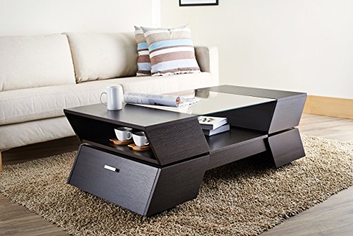 - Feature : Ultra-modern Contemporary style coffee table / Eye-catching modern geometric profile / Tempered glass table top with wooden frame / Open shelves and drawers for storage / Measures 47 Inch wide by 23.62 Inch deep by 16.81 Inch high