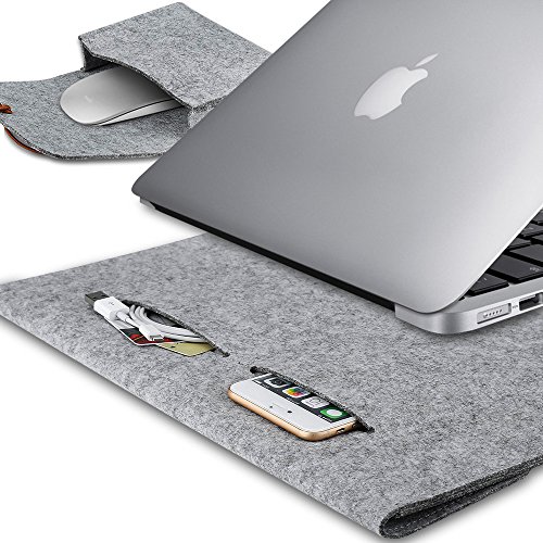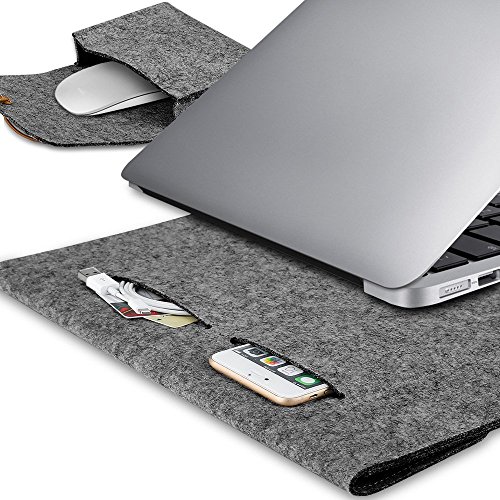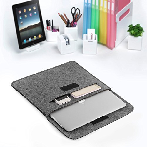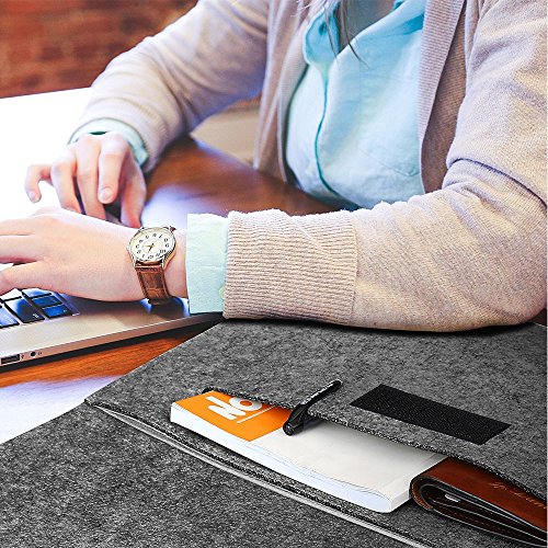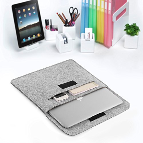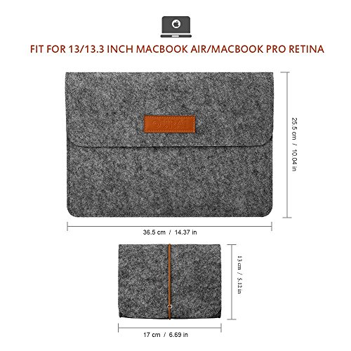-. Feature : Synthetic Leather Velcro closure for best security to your laptop; High-quality felt outside and soft flannel inside. / Practical design - Sustainable, renewable and biodegradable, for 13/13.3 inch Macbook Air/Macbook Pro Retina. / One main compartment for laptop and second compartment for magazines, books, tablet etc; Two back pockets lined with flannel for cellphone, earphones, wallet etc. / Lining material is mold-proof and wear-resisting, does not scratch your computer; High density material surface and Not easy pilling for long-term use. / External dimensions: 14.4 x 3.9 x 10, fit for 13/13.3 inch Macbook Air/Macbook Pro Retina.