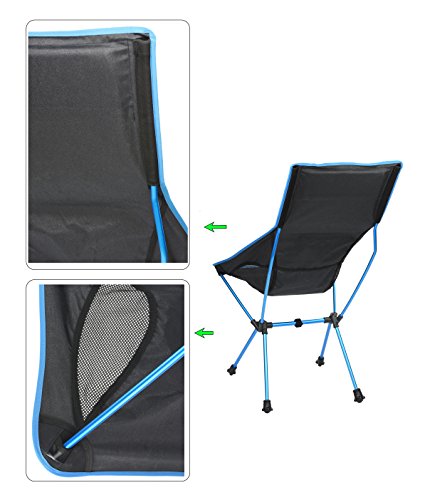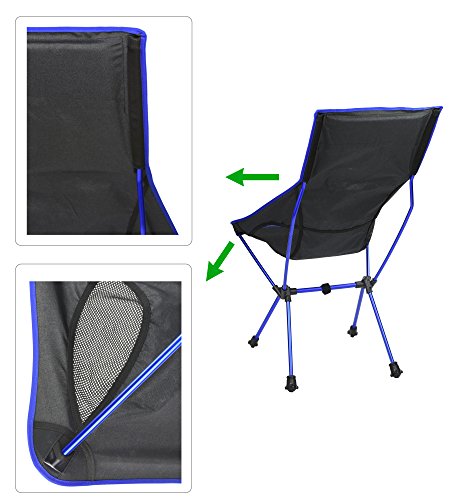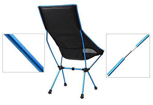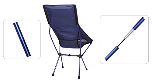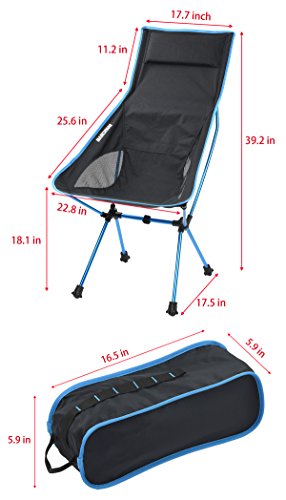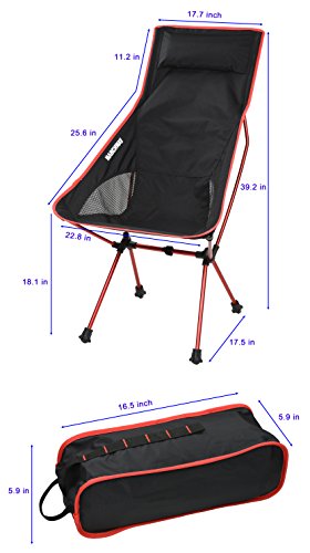 Chair Specification: Seat Height: 18.10 inch - Back Height: 39.20 inch - Seat width: 22.80 inch - Shoulder width: 17.70 inch; Weight: 2.7 lb; Carrying case: L 16.5 * W 5.9 *H 5.9 inch Fabric: Ripstop and anti-slip Nylon; Frame: High strength aluminum alloy; Maximum Weight Capacity: 250 lbs
