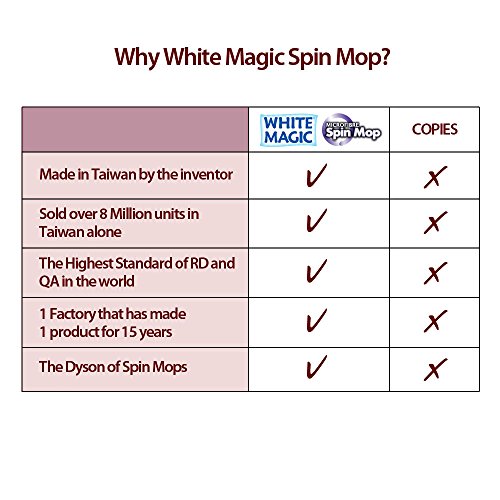 Studio : White Magic Publisher : White Magic Binding : Kitchen Product Description ORIGINAL AND BEST - The White Magic Spin Mop is the only Spin Mop on Amazon that is made by the same factory that invented the first and original system more than 10 years ago. Do not get fooled by low quality imitations. With over 8 million units sold, there's no question about it- White Magic cleans better! PROVEN PERFORMANCE - We have been selling the White Magic Spin Mop for over 5 years in. Australia and our products have received the coveted Red Dot Design award. We have proven ourselves against the imitations and once you try our Spin Mop you will know what true Spin Mop performance is all about. We are so confident we give a one (1) year replacement guarantee on the bucket. HAND DRIVEN SPIN MOP - This model is designed for people who are stronger in their upper body than lower body, the compressing handle spins the mop at 2600 RPM to clean and dry your mop head. BEST HANDLE AND MOP HEAD - The microfiber mop head included ismade from 8000 strands of polyester microfiber (much thirstier than the fatter imitations) -1 Handle that is 59 inches long so that there is no need to bend or strain your back. 0