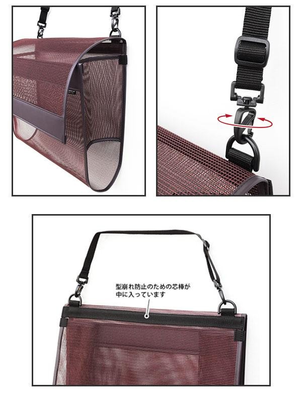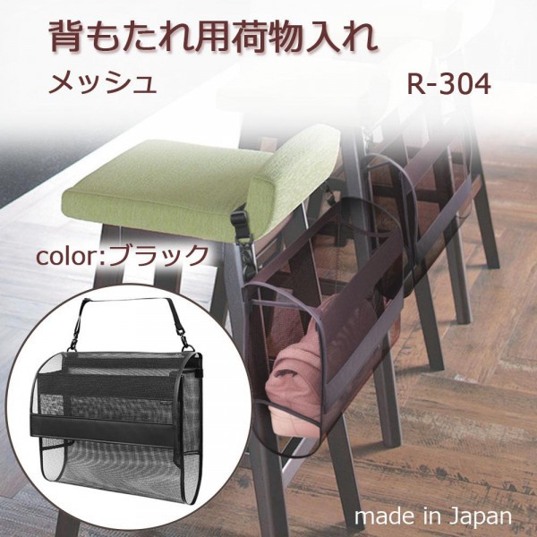 様々な場所で使いやすいイスの背もたれに取り付けるタイプの荷物入れ。長さ調節ができるベルトは、ねじれ防止用に360度回転するフック付きです。 |