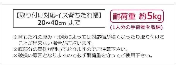 | 仕様 | 耐荷重:約5kg 収納目安:1人分 取付け対応イス背もたれ幅:20~40cm |