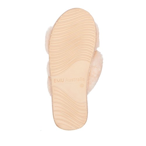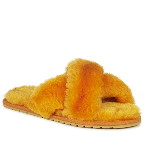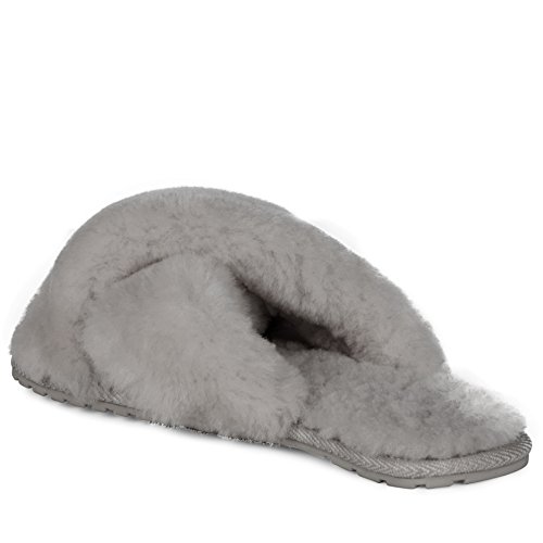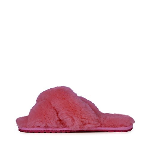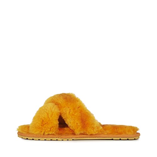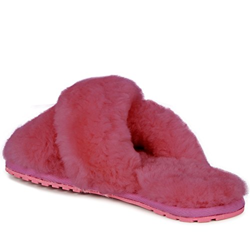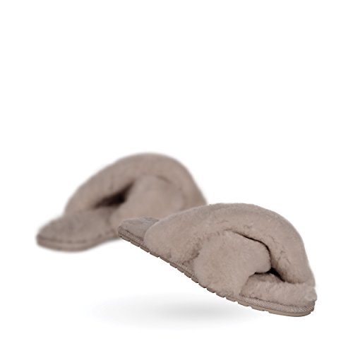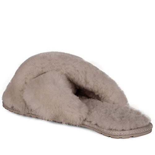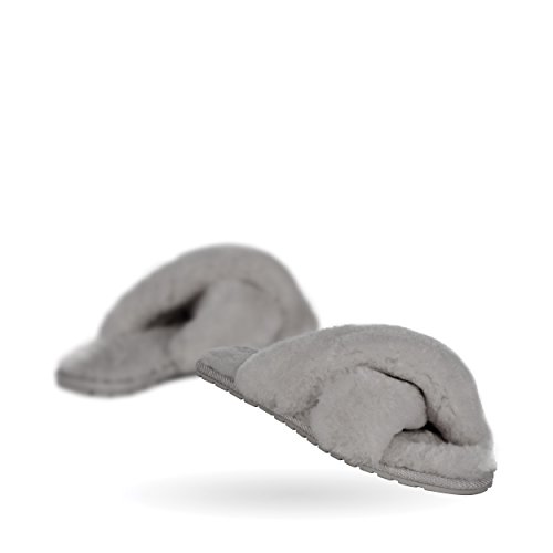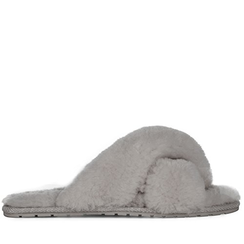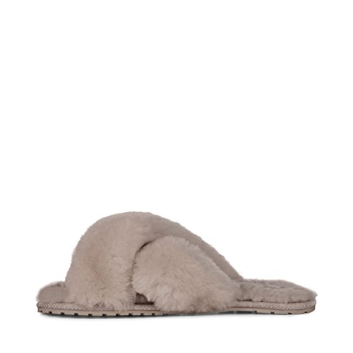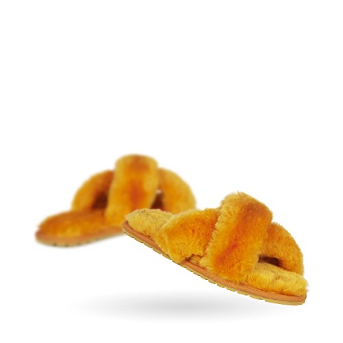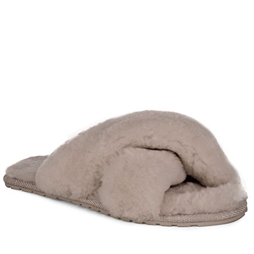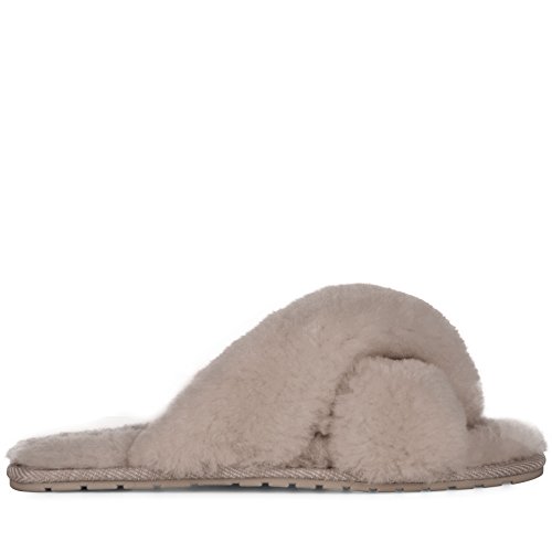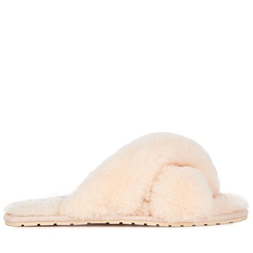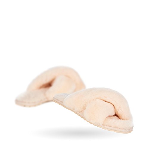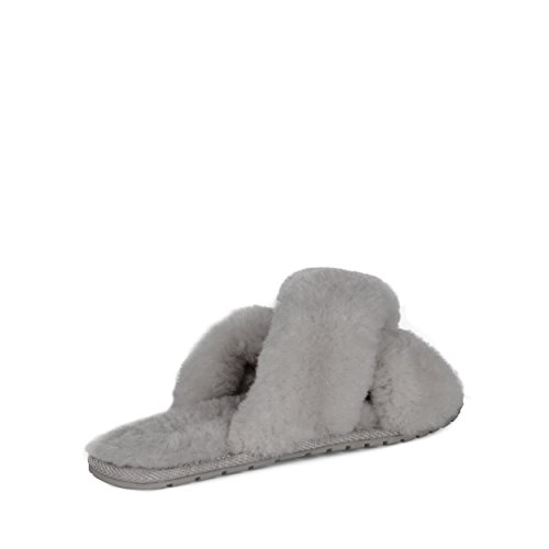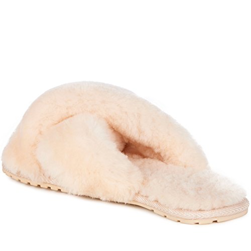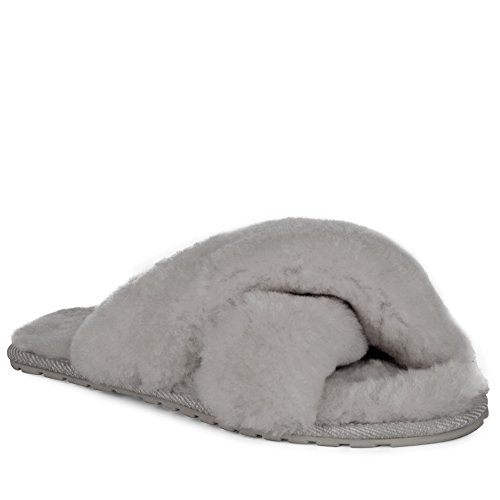 Product Description Fluffy and cosy, the Mayberry slipper encloses your feet in year-round luxury. Wide crossover straps made with the softest Australian sheepkin wrap feet in comfort and the lightweight flexible rubber outsole provides traction indoors and out. Material: Sheepskin, Rubber. 0