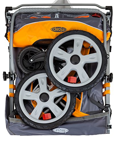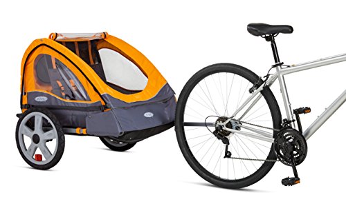 Make your time outdoors with your family quality time with the InSTEP Sierra Double Bicycle Trailer. It offers the perfect transportation options for your little ones whether you want to go on a bike ride or a brisk walk. The 2-in-1 yellow and gray canopy has a mesh screen to detour pesky bugs. A weather shield also helps keep raindrops and wind away from your precious cargo. When the trailer is converted to a stroller with the kit that's included, the front wheel swivels. A parking brake even adds more control while it's in stroller mode. The pneumatic tires help you cruise along comfortably whether you're towing the kids on your bike or using the trailer as a stroller. It assembles in no time and folds together neatly for easy storage. Holds up to two children comfortably; maximum weight limit is 100 pounds total. Now you can spend more time with your little one, get in the workout you need, and show your children how much fun a healthy lifestyle can be - and without the sticker shock. InSTEP prides itself on providing joggers and trailers that not only measure up to your expectations of comfort, performance, and convenience, but also appease your budget with outstanding value prices. InSTEP products have more features, more function, tasteful style, and sharp colors that you will be proud to roll out on the town. Hey, becoming a parent doesn't have to mean surrendering your sense of taste. 2-in-1 canopy helps keep bugs and wind away. Frame folds, wheels release for easy storage. Includes stroller conversion kit. Swiveling front wheel and handlebar in kit. Holds 2 children; 50 lbs. maximum weight each.