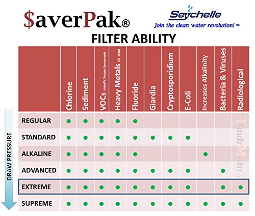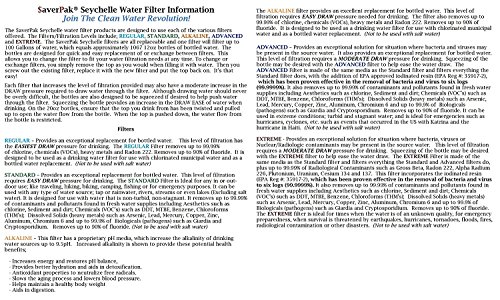 EXTREME Filter - Provides an exceptional solution for situation where bacteria, viruses or Nuclear/Radiologic contaminants may be present in the source water. This level of filtration requires a MODERATE DRAW pressure for drinking. Squeezing of the bottle may be desired with the EXTREME filter to help ease the water draw. The EXTREME Filter is made of the same media as the Standard filter and filters everything the Standard and Advanced filters do, plus up to 99.99% of Radiological Contaminants such as Gross Beta, Radon 222, Alpha Radium 226, Plutonium, Uranium, Cesium 134 and 137. This filter incorporates the iodinated resin (EPA Reg #: 35917-2), which has been proven effective in the removal of bacteria and virus to six logs (99.9999%). It also removes up to 99.99% of contaminants and pollutants found in fresh water supplies including Aesthetics such as chlorine, Sediment and dirt; Chemicals (VOC's) such as DDT, MTBE, Benzene, Chloroforms (THM's); Dissolved Solids (heavy metals) such as Arsenic, Lead, Mercury, Copper, Zinc, Aluminum, Chromium 6 and up to 99.9% of Biologicals (pathogens) such as Giardia and Cryptosporidium. Removes up to 90% of fluoride. The EXTREME filter is ideal for times when the water is of an unknown quality, for emergency preparedness, when survival is threatened by earthquakes, hurricanes, tornadoes, floods, fires, radiological contamination or other disasters. (Not to be used with salt water). ALL MANUFACTURER'S WARRANTIES APPLY - (Purchase Confirmation Required)Feature