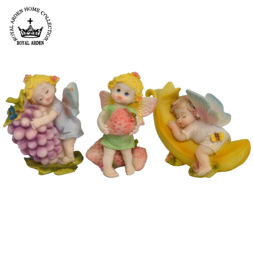 愛らしい表情としぐさがキュートなベビーフェアリーたち。お部屋に飾ると癒されます♪ 製造国:中国 素材・材質:樹脂 商品サイズ:W7~11×D5.5×H7~9cm ※サプライヤー直送品 ご注文後3~4営業日後の出荷となります【商品名】ロイヤルアーデン オブジェ フェアリー 3Pセット フルーツ 64200