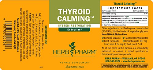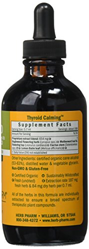 Support healthy function of the endocrine system with the herbs in Thyroid Calming formula from Herb Pharm. The herbs used to prepare this compound are Certified Organically Grown or they are Sustainably Wildcrafted in their natural habitat. They are hand-harvested at their optimal potency, and are then promptly extracted while still fresh & succulent or after being carefully shade-dried. All of the herbs in this formula are individually extracted to ensure a broad spectrum of therapeutic plant compounds. Caution: Seek expert medical advice before taking during pregnancy or nursing. Not for use in hypothyroidism or thyroid enlargement. Use with caution in persons taking thyroid and heart medications.Feature