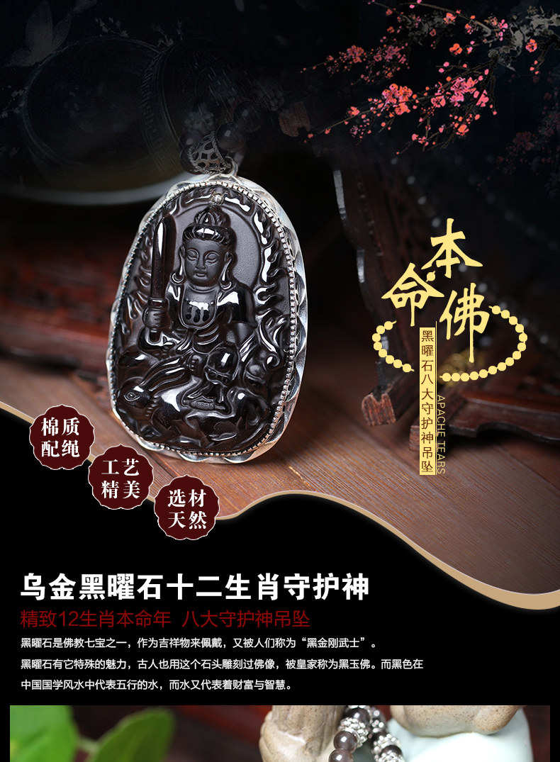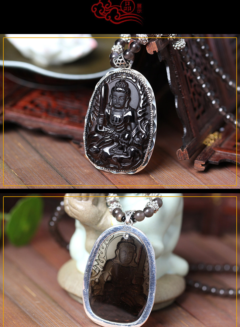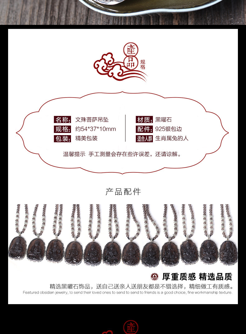 开光冰种黑曜石925银文殊菩萨十二生肖属兔本命佛守护神吊坠