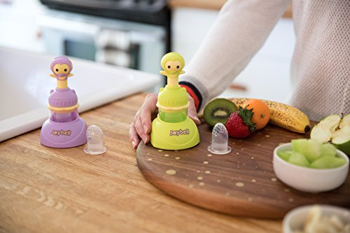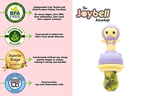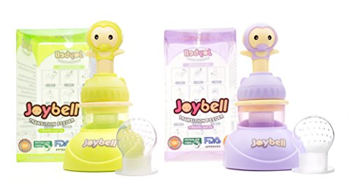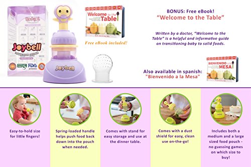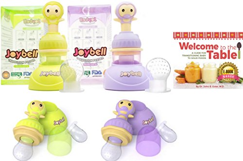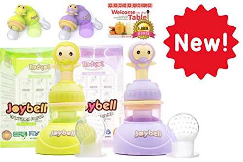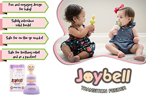 Studio : Tuscobia Products Publisher : Tuscobia Products Binding : Baby Product Product Description Joybell's Transition Feeder is designed to make your baby's transition to solid foods safe, easy, satisfying, and fun. It allows baby to explore new tastes and textures at his/her own pace and helps eliminate the mess that naturally results when babies are developing hand-mouth coordination. The Transition Feeder is perfect from the moment your baby is ready to start solids - even watery purees. The nipple on the Transition Feeder feels familiar and soothing to your baby which is a perfect means of introducing unfamiliar flavors. Equally important, use at the dinner table helps develop social skills through active participation in family meal time. Baby can explore the world of solid foods with the family, while sitting at the table because meals are more than just feeding, they are times for families to come together. How the Transition Feeder Works Fill the silicone food pouch with cut fruit, vegetables, meat. Then, under adult supervision, allow your baby to hold, mouth and suck on the transition feeder. The small perforations in the food pouch allow nutrients and flavors out while keeping in dangerous chunks that can cause choking. Can be used with purees, smoothies, fruits, veggies, baby foods, yogurts, breads, ice cream, and more. PLUS the Transition Feeder offers instant relief of teething pain. Just put ice chips, frozen strawberries or bananas into the Feeder; it soothes the pain from cutting teeth without the risks of drugs. FEATURES ? Easy to disassemble for complete cleaning ? Top-shelf dishwasher safe ? Sturdy stand for easy storage at kitchen table or counter ? Dust cover for clean use on the go BONUS Welcome to the Table, free eBook written by doctor with everything you need to know about starting baby on solids beautifully formatted in PDF 0