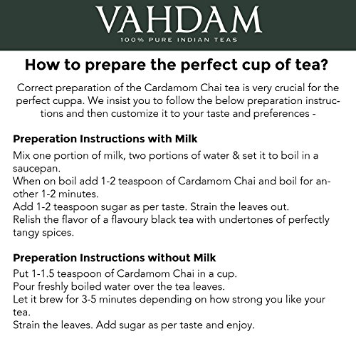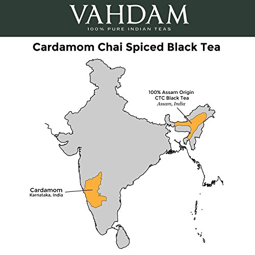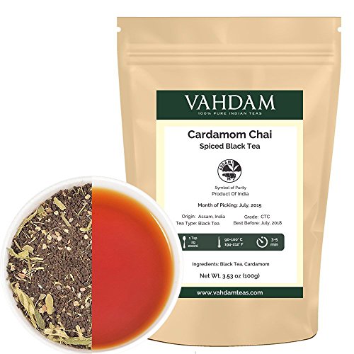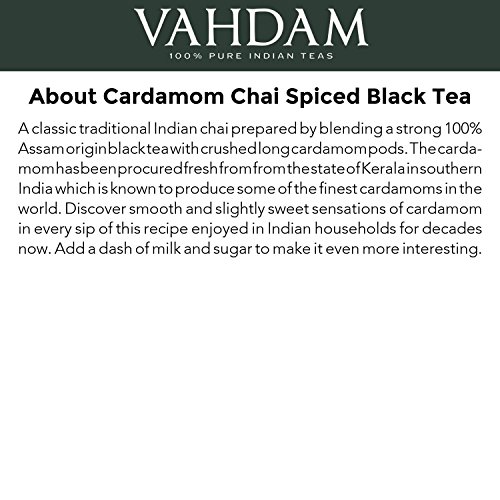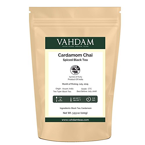 -. Binding : Misc. -. Brand : Vahdam Teas -. EAN : 8901205030033 -. Feature : Garden Fresh Harvest Tea / 100% Certified Pure & blended Indian Tea also available on Amazon.com or Vahdam Teas / PURE & UNBLENDED - 100% Pure Unblended Indian Tea Certified by the Tea Board of India / DIRECT FROM INDIA - Based in India, Vahdam Teas are procured Direct from Farmers & Shipped Worldwide / Brought you to by Vahdam Teas from India -. IsAdultProduct : 0 -. Label : Vahdam Teas -. Manufacturer : Vahdam Teas -. ProductGroup : Grocery -. ProductTypeName : GROCERY -. Publisher : Vahdam Teas -. Size : 3.53oz -. Studio : Vahdam Teas -. Title : Cardamom Chai Spiced Black Tea, Premium Assam CTC Blended with Fresh Indian Cardamom (Elaichi), Loose Tea, 3.53oz/100g (Makes 35-40 Cups)