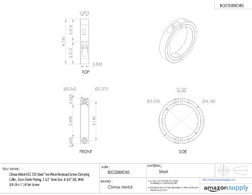 Climax Metal H2C-350 Steel Two-Piece Recessed Screw Clamping Collar, Black Oxide Plating, 3 1/2" Bore Size, 4-3/4" OD, With 3/8-24 x 1 1/4 Set Screw