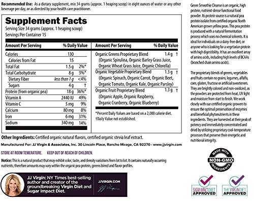 -. Feature : GET YOUR GREENS & PROTEIN IN ONE EASY SMOOTHIE - You shouldn't have to hold your nose to get your greens! JJ Virgin's Green Smoothie Cleanse is packed with over a dozen whole fruits and vegetables. But all you'll notice is the yummy natural strawberry-vanilla flavor. / CLEASE WITHOUT THE BLOOD SUGAR CRASHES - If you've ever tried a juice cleanse that left you feeling starved, cranky, and exhausted, you know how to detox the wrong way. Now meet the RIGHT way: Green Smoothie Cleanse, with the protein you need and a delicious strawberry-vanilla flavor you're going to love! / HEALTHY, NATURAL DETOX THAT'S SAFE FOR DAILY USE - If you're looking for an easy way to get wholesome nutrition without a trip to the salad bar, Green Smoothie Cleanse is the answer! Even the pickiest palates will down kale, wheatgrass, spinach, and carrots without a second though. / BALANCED, VEGAN-FRIENDLY NUTRITION - The primary ingredients in Green Smoothie Cleanse include low-allergenicity pea protein and a blend of 14 whole fruits and veggies, including 7 types of greens. / FROM NEW YORK TIMES BESTSELLER & CELEBRITY NUTRITIONIST JJ VIRGIN - Known for her bestselling books The Virgin Diet and The Virgin Diet Cookbook, JJ Virgin has transformed the lives of many with her tasty line of nutritious shakes and bars, as well as exceptionally high-quality supplements. Trust her to provide highly effective and bioavailable products of the utmost quality.