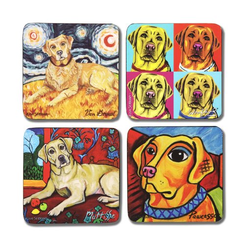 - Each coaster features a different artistic rendering of a Yellow Lab