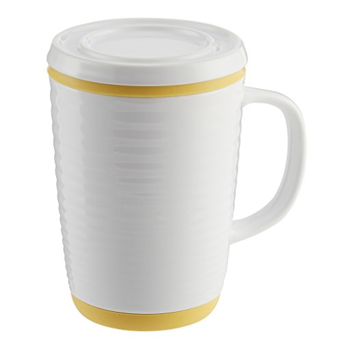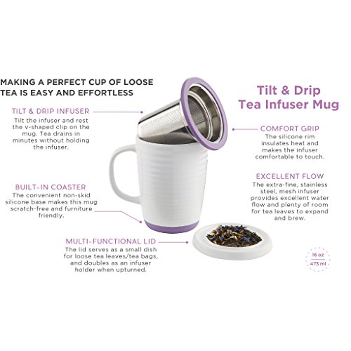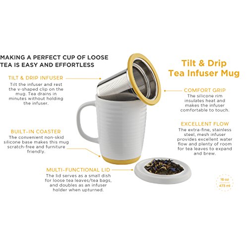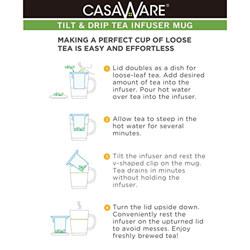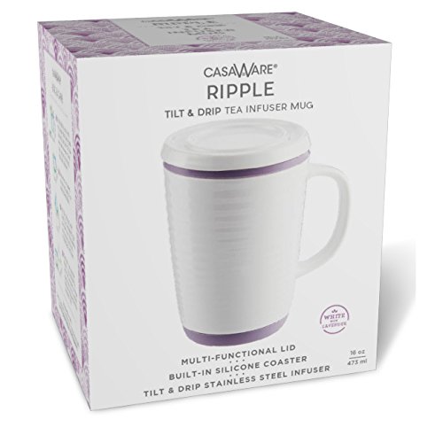 -. Brand : casaWare -. Feature : The Body of the Mug has a Unique Ripple Design / Tilt and Drip Infuser: Tilt the infuser and rest the v-shaped clip on the mug. Tea drains in minutes without holding the infuser. Capacity 16-Ounce / 473-millilter / Multi-Functional Lid: The lid serves as a small dish for loose tea leaves/tea bags, and doubles as an infuser holder when upturned / Built In Coaster: The convenient non-skid silicone base makes this mug scratch-free and furniture friendly. Mug is made of Ceramic / Excellent Flow: The extra-fine, stainless steel, mesh infuser provides excellent water flow and plenty of room for tea leaves to expand and brew -. Label : casaWare -. Manufacturer : casaWare -. ProductGroup : Kitchen -. ProductTypeName : KITCHEN -. Publisher : casaWare -. Studio : casaWare -. Title : Casaware 16-Ounce Tilt & Drip Ripple Tea Infuser Mugs