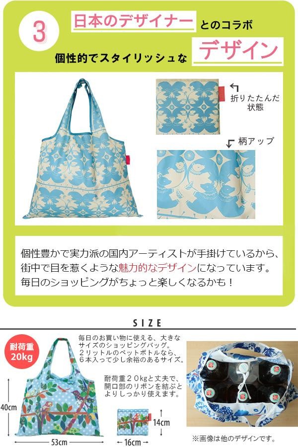 | 使わないときは折りたたんで収納できる、携帯に便利なショッピングエコバッグ。たっぷり容量で耐荷重はなんと20kg!!マチ付きにもでき、安定感も◎。日本のアーティストとコラボした個性豊かなデザインのDESIGNERS JAPANシリーズです♪ |