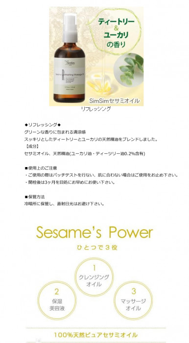 SimSimセサミオイルは、圧搾機を使い、ゴマを押しつぶして油を搾り出した後、和 紙や布などでろ過を繰り返す圧搾法で抽出。専用の窯を使い、キュアリング(加熱処理)を行っています。ベタつかず、サラッとした使い心地なので、クレンジ ングオイル・美容液・保湿液・マッサージオイルなどとしてお使いいただけます♪
