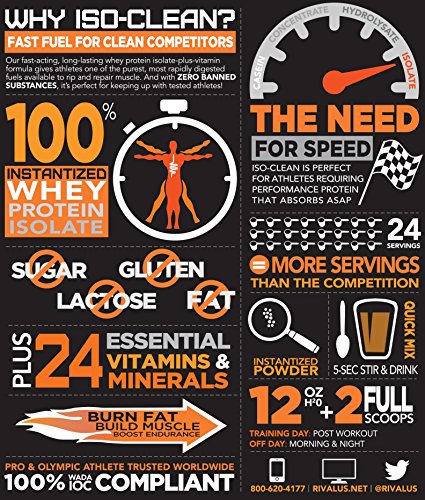 ReleaseDate : 2016-09-22 Studio : Rivalus Publisher : Rivalus Binding : Health and Beauty Product Description Saying “whey protein” is like saying “chair.” Just as there are lots of different types of chairs, whey proteins are available in a variety of different forms. Two of the most common varieties are whey concentrates and whey isolates. From a protein quality standpoint, both are excellent. The key difference is the quantity of protein found in each. Whey protein isolates undergo additional purification steps to remove virtually all of the fat, lactose, and cholesterol, thereby isolating the protein, hence the name. ISO-CLEAN is made with 100% whey isolates (ISO-), which yield a ton of protein, but little else (CLEAN). This fast-acting formula supplies 50 grams of super-pure, super-effective protein plus a host of essential micronutrients to help you max-out every serving. If you’re the “go big, or go home” type, ISO-CLEAN is your protein. 0
