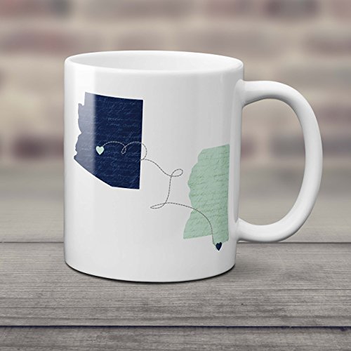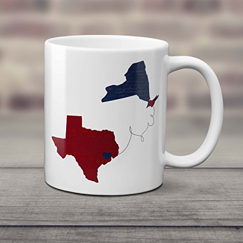 Choose your states, cities, and colors when ordering. Hearts will be black, unless you choose a darker colored state then they will be either white or the color of the opposite state, depending upon what works best with the background color of the mug.