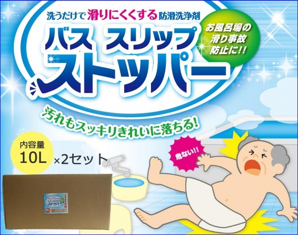 | お風呂場の床面は、汚れやヌメリがつきやすく、水に濡れた場合は滑りやすくなるため、常に転倒事故の危険が伴います。これらの悩みを無くすために開発されたのが「バス スリップ ストッパー」です。タイル・石材の汚れを除去すると同時に、滑りにくい材質に変えてしまう画期的な洗浄剤です。また、ユニットバスでは、しつこい水アカや汚れを除去し、新品同様の床面に変えて滑りにくくします。 |