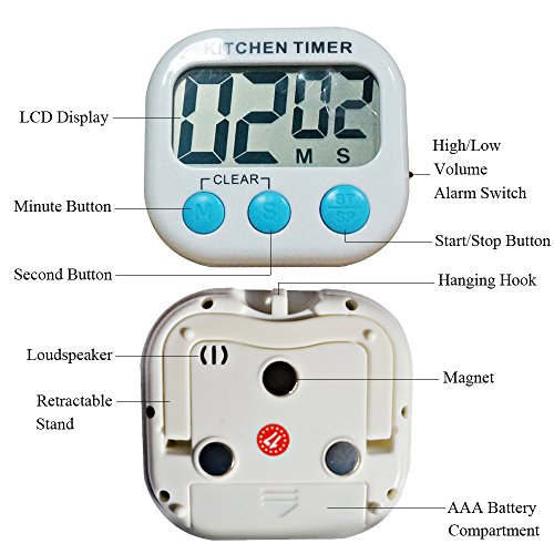 Studio : Sun Schnee Publisher : Sun Schnee Product Description Product Description: Perfect timer for cooking, homework, exercise, gym, workout, sports, games and classroom activities. Maximum time volume is 99 minutes and 59 seconds. The alarm can be loud set if you want to hear it in another room, or you can also set it in low volume as needed. The large LCD display is clear and easy to read, you can read it easily anywhere in the kitchen through 3 methods of placements with magnet, hanging hook and retractable stand.