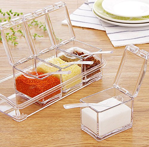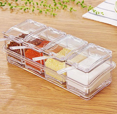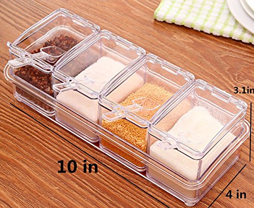 -. Feature : Size: about 10*4*3.1inch / Comes with cover and 4 spoons jars stored in a tray, constructed with 4 bulgy corners All condiments can be found easily in this lidded spice jars,Cover with small opening that fits the spoon, very practical. / 100% brand new eco-friendly PS, keeps your spice fresh, odor-free and prevent the ash / Can be used to hold a variety of condiments: salt, pepper, sugar, spice, corn starch and chicken broth powder and more / 100% brand new and high quality