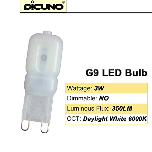 DiCUNO G9 LED Light Bulb, 3W (30W Halogen Bulb Replacement) 350lumen, 6000k Daylight White, G9 Bi Pin Base, Non-Dimmable, AC 110-130V JCD Type, Chandeliers, Bathroom, Ceiling Lights,10-Pack