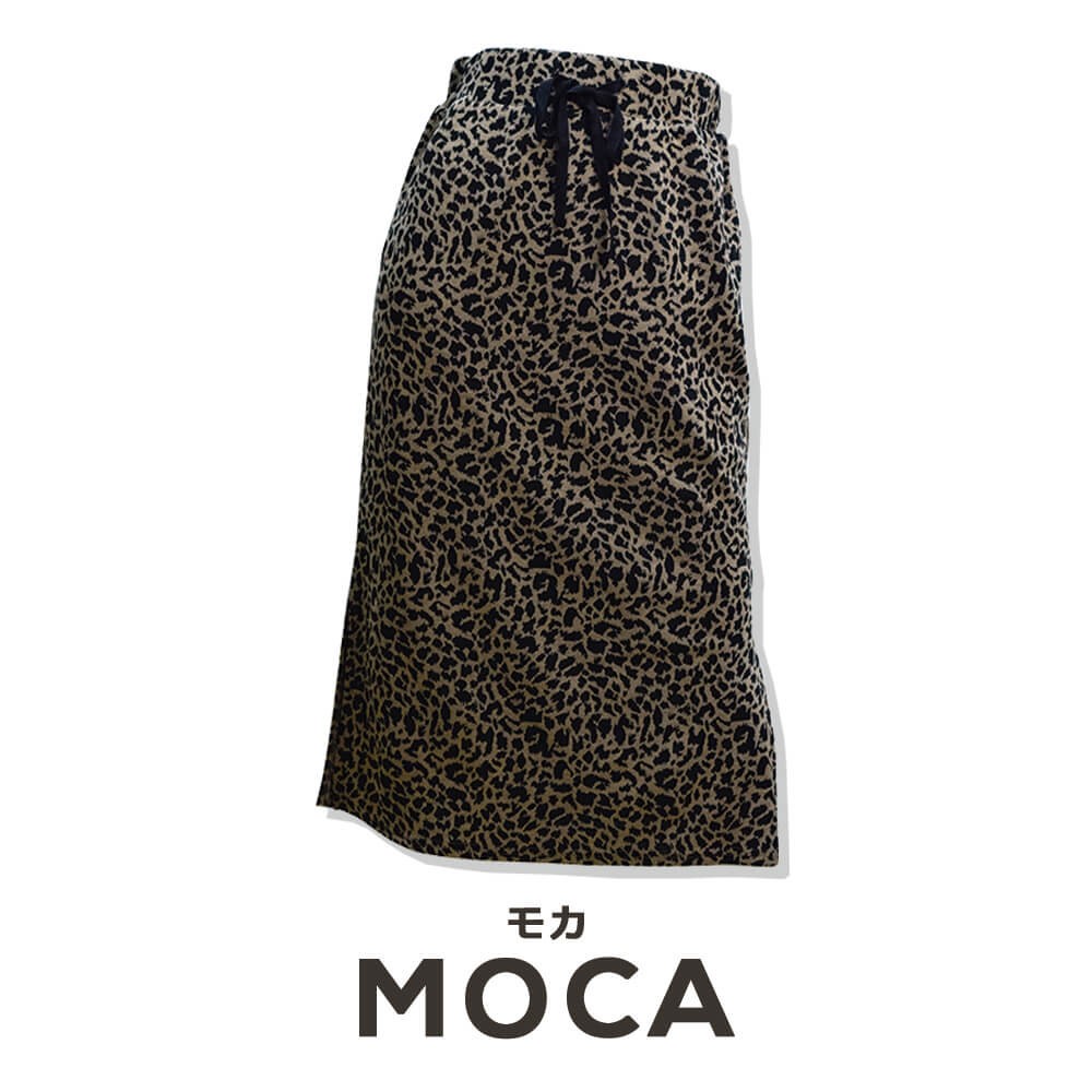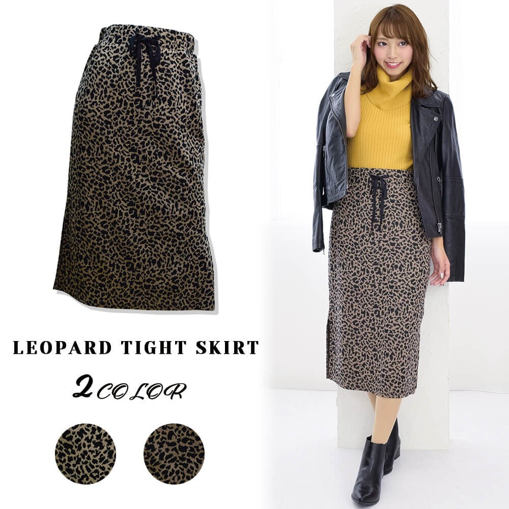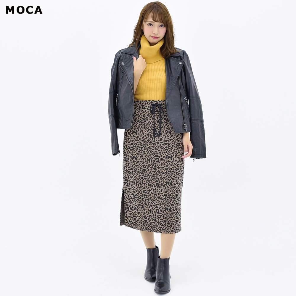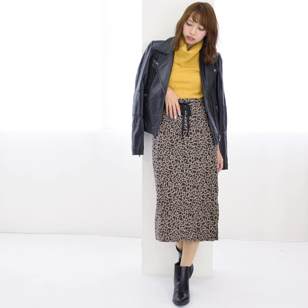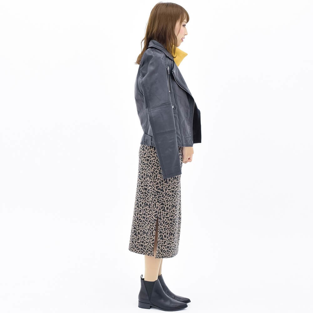 ヒョウ柄でも落ち着きのあるパターン、配色がポイントのタイトスカート。