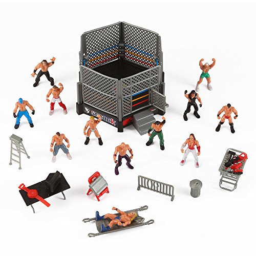 -. Feature : 32 Piece Miniature Wrestling Playset / Accessories include table, trash can, barricade, stretcher, cages, ladder, chairs, briefcase, extinguisher, cart, belt, etc. / Arena Can Be Disassembled and Put Back Together / 12 Assorted Wrestlers - Each Measures 2 inches tall / Wrestling Arena 5" x 5"