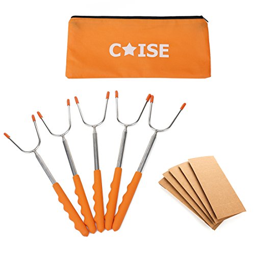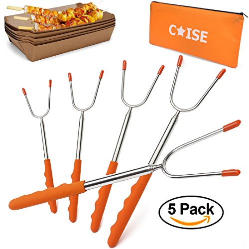 Marshmallow Roasting Sticks, Set of 5 -Stainless Steel Roasting Sticks Kit with 45" Extendable Telescoping Rotating Forks and Paper Food Trays, Hot Dog Smores Forks