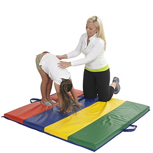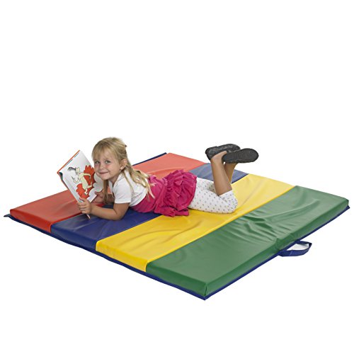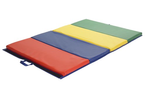 Heavy-duty, 4-panel, 14-mil vinyl mat in bright primary colors. Convenient handles and "loop-lock" extensions for extending with additional mats. Dense 2 in. thick polyurethane foam. Wipes clean, easy to sanitize. Folds easily for storage. Conforms to strict CA-117 guidelines. Use with adult supervision only. Not intended for use with weights and heavy machineries or as professional athletic mat. 4 ft. L x 4 ft. W. 4 ft. L x 6 ft. W. 4 ft. L x 8 ft. W.Feature