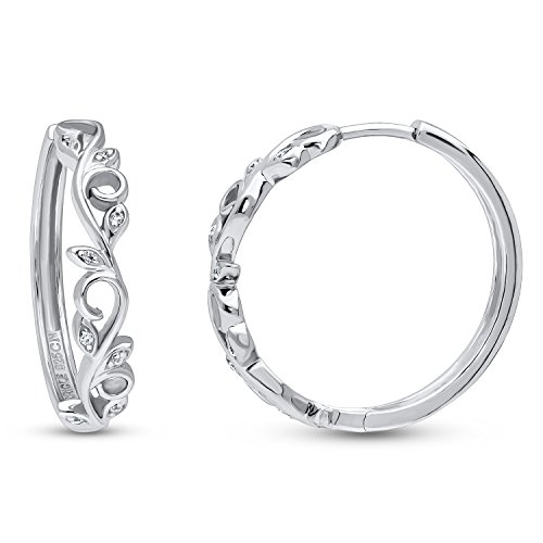 These filigree leaf hoop earrings shimmer with delicate and refreshing nature-inspired details. Made of rhodium plated fine 925 sterling silver. Set with 0.08 carat round cut clear cubic zirconia (1mm) in 2-prong setting. Earrings measure 0.19 inch in width, 0.98 inch in diameter. Hinged snap backs. Imported.