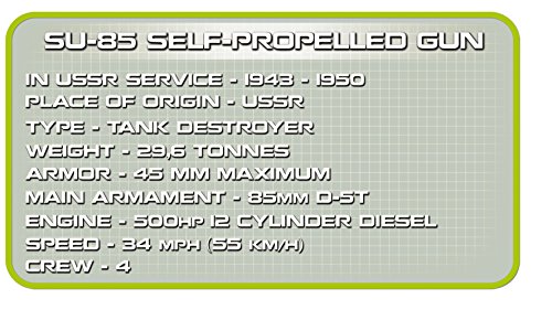 ERSTICKUNGSGEFAHR AUFGRUND VERSCHLUCKBARER KLEINTEILE. -. Manufacturer : COBI Factory S.A. -. Model : 2467 -. MPN : 2467 -. PackageQuantity : 1 -. PartNumber : 2467 -. ProductGroup : Toy -. ProductTypeName : TOYS_AND_GAMES -. Publisher : COBI Factory S.A. -. ReleaseDate : 2015-11-06 -. Studio : COBI Factory S.A. -. Title : COBI 2467 - Small Army WWII SU-85 Tank Destroyer - 400 Bausteine