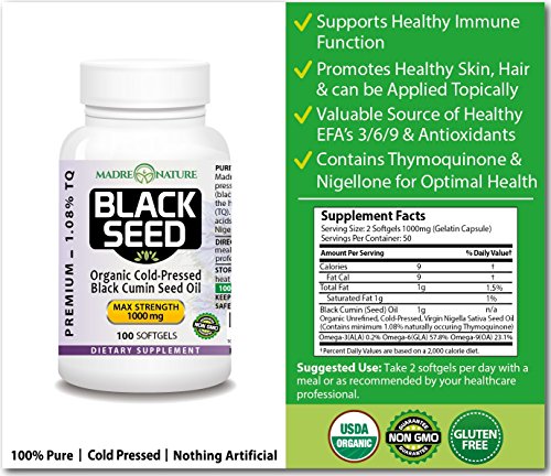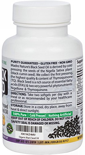 -. Binding : Health and Beauty -. Brand : Madre Nature -. IsAdultProduct : 0 -. Label : Madre Nature -. Manufacturer : Madre Nature -. ProductGroup : Health and Beauty -. ProductTypeName : HEALTH_PERSONAL_CARE -. Publisher : Madre Nature -. Studio : Madre Nature -. Title : Organic Black Seed Oil Capsules 500mg x 100 count