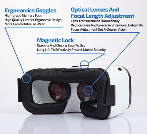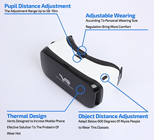 -. Feature : FAST & EASY FOCUS LENSES: Our focus lenses are high quality, crystal clear. You can focus easily with an remote that will adjust to your natural eyesight quick. Unlike other brands, this practical feature protects you by removing any eye strain that causes pain! / WIDELY COMPATIABLITY: Cudevs VR Glasses can fit for most smartphones with screen sizes 4.0 inch - 5.7 inch Ios and Android Phone, immersive experience for any ages. / ADJUSTABLE FOCAL DISTANCE AND PUPIL DISTANCE: It is can satisfy different groups of people.In addition,soft sponge edges around the face mask which goes against your face well.you can also adjust the three straps correctly before wear it on your head, your head and neck will not feel sore for having that weight pulling down on your face. / PRACTICAL DESIGNS:Lightht weight and adjustable phone mount can hold your phone in place to keep away scratching,and removable cover works for heat emission,Flexible frame of lenses makes it more easy to clean,flexible and adjustable headband is suitable for different people. / ENJOY YOURSELF FULLY: Transform your smartphone to a portal to a new reality. Enjoy true 360° videos and photos as you immerse yourself in the world of VR from your own home