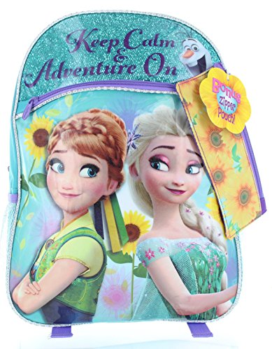 This 16 Inch backpack features your favorite characters Anna and Elsa from the world renowned Disney movie Frozen. It comes with a zip front pocket and side mesh pockets for extra storage. The backpack straps are adjustable and made of durable material. An extra highlight of this backpack is that comes with a sunflower zippered pouch.Feature