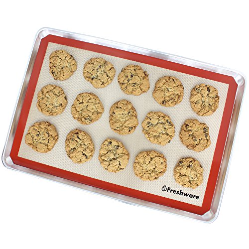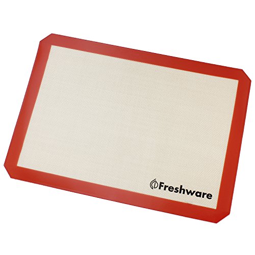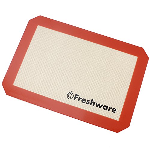 Freshware BM-104 Silicone Non-Stick Baking Mat with Cut Corner for Macaron, Whoopie Pie, Cookie, Creme Puff and more, Full Size, 24.4 x 16.5 inch turns any pan or rack into a non-stick surface instantly. It fits perfectly into a 26 x 18 inch full size sheet pan. (Mat Size: 620 x 420 mm for a 655 x 455 mm full size sheet pan)