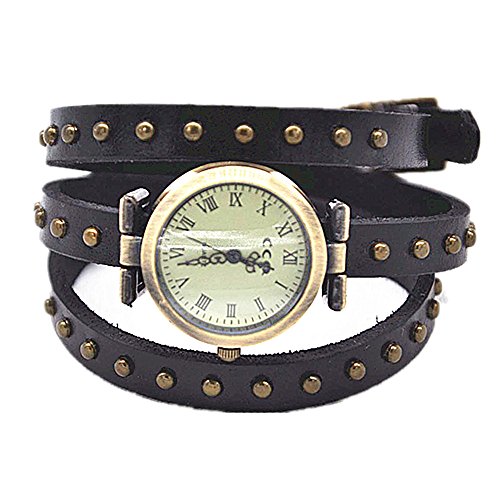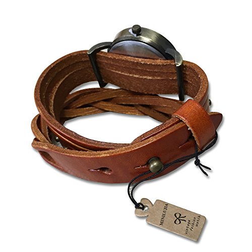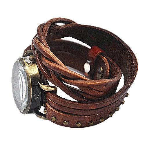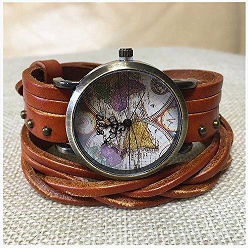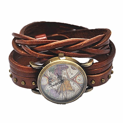 MINILUJIA Women's Watches Genuine Leather Wrist Watch Brown DESCRIPTION:Movement: Quartz Case Material: Glass Band Material: High quality leather Band World map watch band is made of genuine leather by handmade,the watch dial back is stainless steel back, good quanity to long wear. Quartz movement round shaped face.vintage bronze color watch face with roman numbers. There are three around size to adjust, or you can bore a hole if you are a spencial wrist size, the watch band has one centimeter gaps on it to adjust. 2 x wrap on wrist to create a striking stacked look, very fashion and personalized. Fit for the wrist size from 6 inch to 7.6 inch, fit for women, yong boy and men. It is not waterproof please don't wear it when swimming,bathing...watch buckle is a screw vintage style studded dark brown leather wrap around watch, a unique watch with delicate bronze studs that looks just gorgeous on,battery in include.Feature