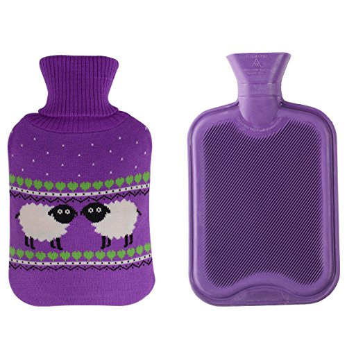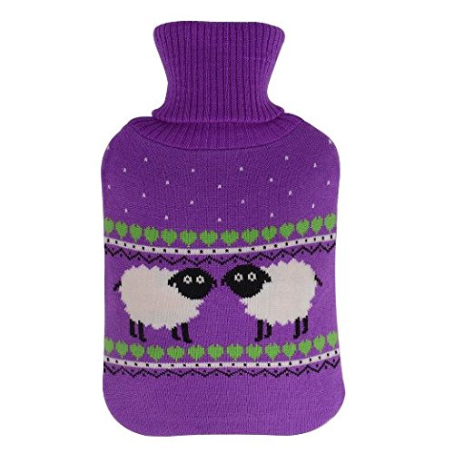 HomeIdeas 2 Liter Classic 100% Natural Rubber Hot Water Bottle with Soft Knitted Cover, For Quick Pain Relief and Comfort (Purple / Purple with Sheep)