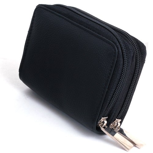 -. Feature : 2 zippered pockets, Measures 4.5" x 3" x 1.5" / Outside ID window / Back pocket opens and expands accordion style with 2 sections / Front pocket expands same way has 6 separate sections / Front pocket also has 5 Card slots between the sections