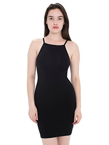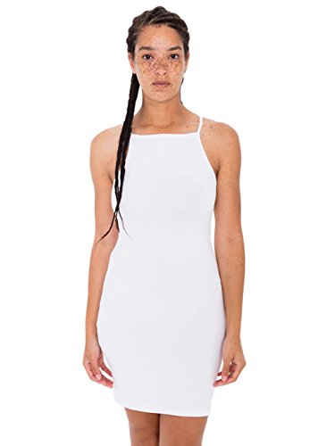 This cotton/spandex mini dress features a high neckline, skinny straps and snug silhouette.