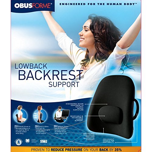 ReleaseDate : 2006-05-01 Studio : Obus Forme Publisher : Obus Forme Binding : Misc. Product Description The Obus Forme Lowback backrest support is the only backrest scientifically proven to decrease pressure on our back by 35% and increase comfort while sitting. The Lowback backrest support relieves back pain by realigning your spine and maintaining an ideal posture. Removable and adjustable lumbar pad offers additional back support to suit your individual needs. 0