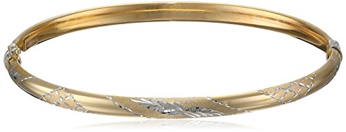 Add style-faring shine to the wrist with the Bonded Sterling Silver and 14k Two-Tone Polished Bangle Bracelet. Accented along a smooth yellow-gold bangle is a modern silver design created out of clean lines and shapes. The strips of sterling silver that fill the bracelet work to create a faceted look, emphasizing similar shine that one would see in a well-cut diamond. The sterling silver is joined with the yellow gold by a unique bonding technique. This bold bracelet is sure to stay secure around any wrist with its box-with-tongue clasp.Feature