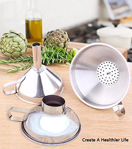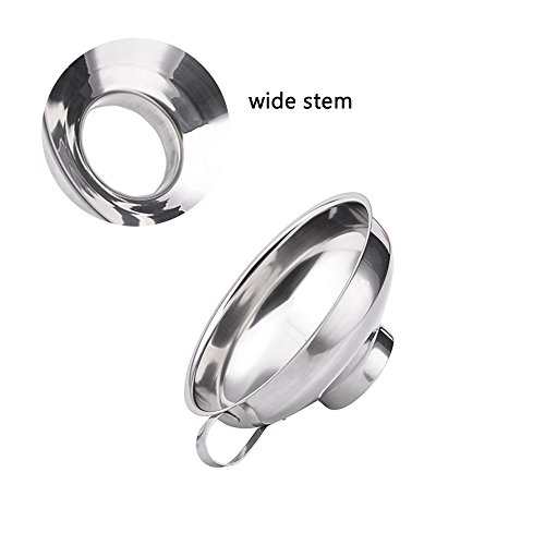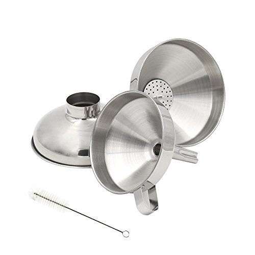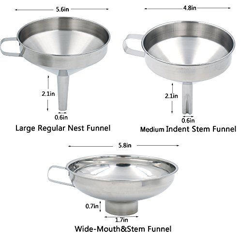 - Essential Funnel Set for Daily Life:Set of 3 assorted sizes kitchen funnels can help you efficiently transfer whatever you need without any blockage.1 wide-mouth funnel applies to transfer dry ingredients or large quantities of liquids.1 large cone funnel with air release channel allows liquids flow faster,plus 1 medium indent stem funnel makes liquid flow steadily.Aided detachable strainer helps strain out large solids to offer you the best refilling,bonus cleaning brush ensures a easy cleanup.