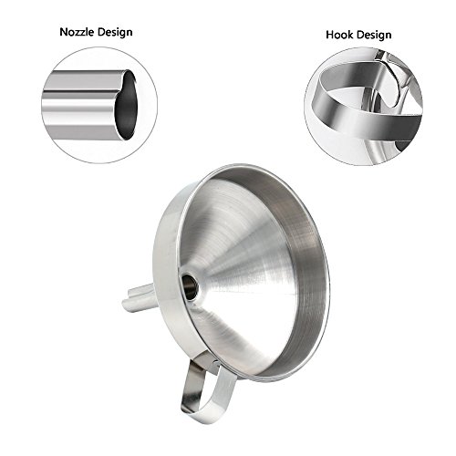 - Use,Clean& Store with Ease:Kitchen funnel designed with side handles,so you just need to grasp the hooks and fill steadily.You can also hang them on the wall with hooks,or nest them in your kitchen cabinet to save place.Since the stainless steel funnel is dishwasher safe,just throw them into dishwasher to get a new funnel.Plus,added brush helps you clean the funnel stem effortlessly.Get this kitchen funnel set you won't need to worry about messy counter any longer.