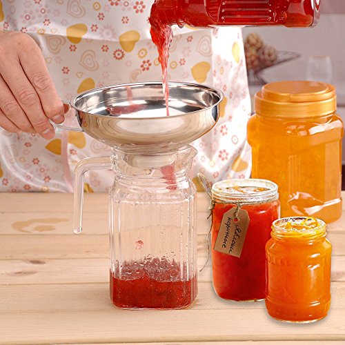 - Multifunctional Kitchen Funnel:These multi-sized funnels have a wide application in your family.They can transfer both solids and liquid from containers to narrow nest bottle and wide- mouth jars without any clogs and spills.The wide-mouth &stem funnel allows pouring pass through easily,such as powder,beans,salt,herbs,perfume and jam.The other two are ideal for transferring reusd cooking oils and brewing wine with the added filter.Perfect funnel set for home,restaurant,and lab.