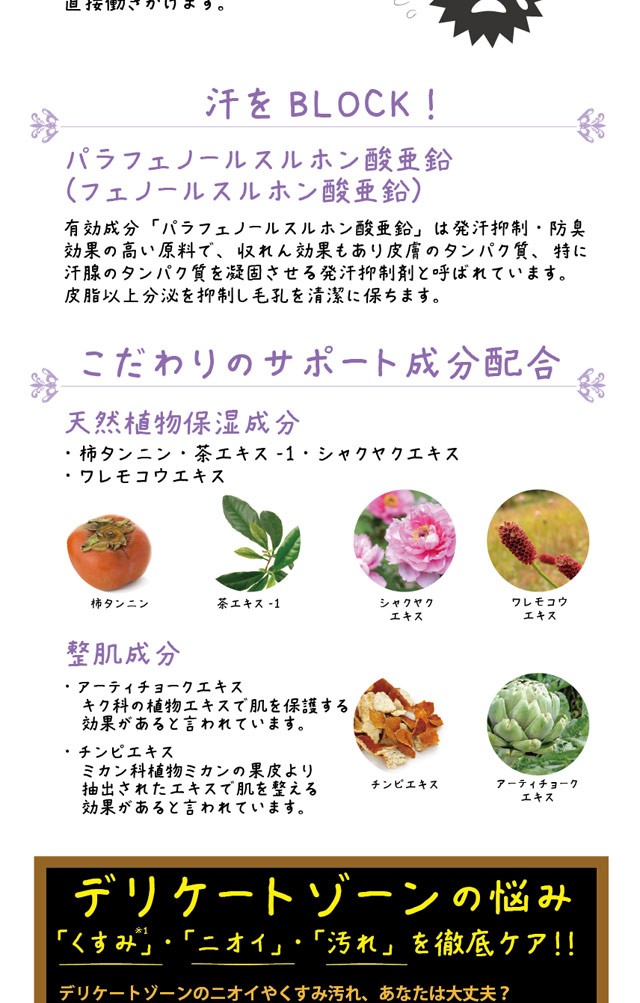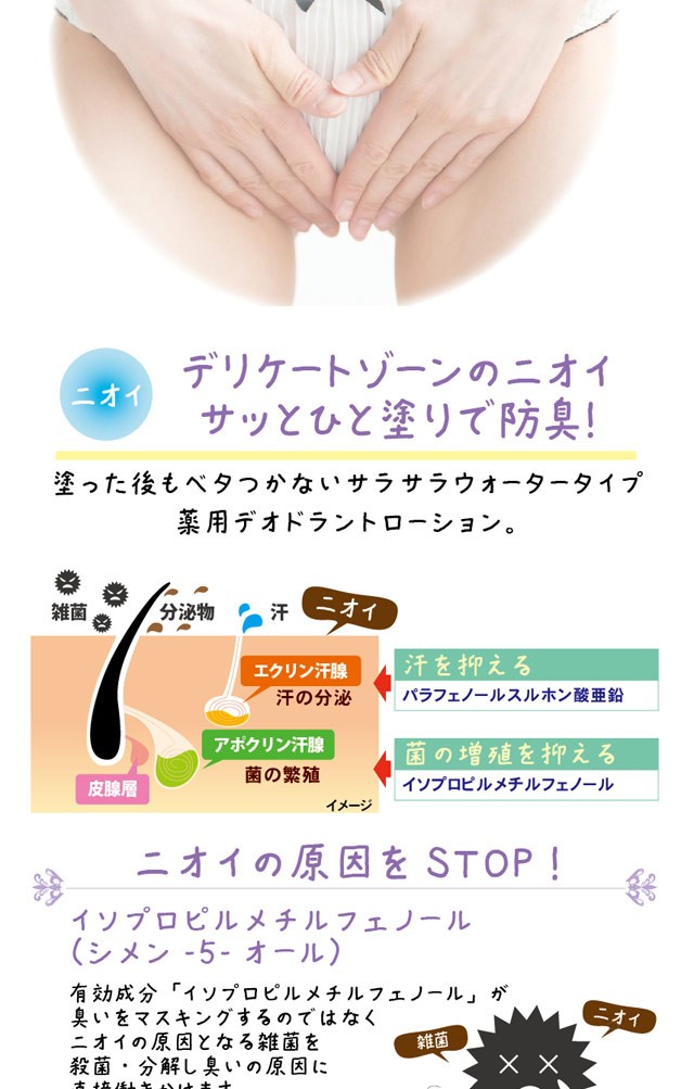 適量をにおいが気になるところ、汗のでやすいところに塗布してください。 |